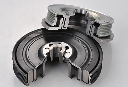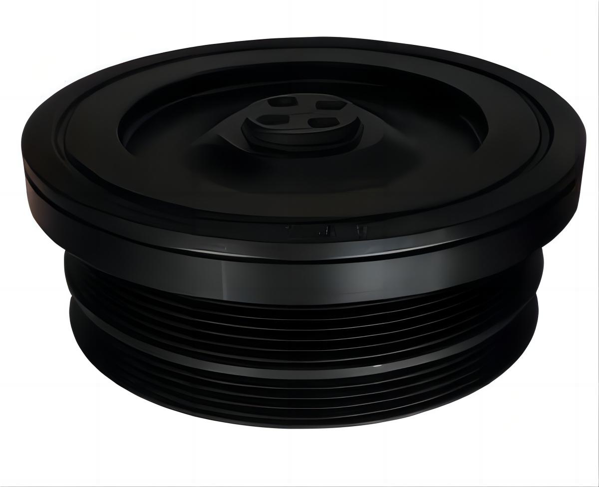 曲軸減震皮帶輪,是發動機前端附件系統的重要零件之一,分為橡膠減震皮帶輪、硅油扭轉減震皮帶輪及橡膠硅油復合型扭轉減震皮帶輪,基本結構一般由輪轂、外圈、橡膠組成,大多安裝于曲軸的前端,傳遞曲軸輸出的扭矩以驅動輪系附件。